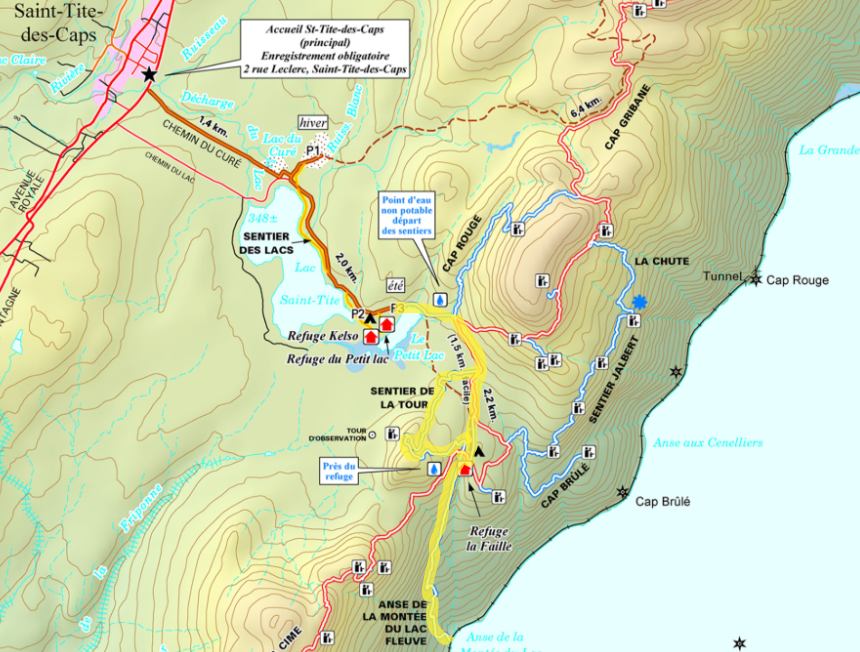 L’accueil est situé au 2, rue Leclerc, Saint-Tite-des-Caps. À partir de la route 138, tournez sur l’Avenue Royale (face à l’église), puis à droite sur la rue Leclerc pour obtenir vos droits d'accès. Le départ de la randonnée se fait ensuite à partir du stationnement P2, situé au bout du chemin de la Station.